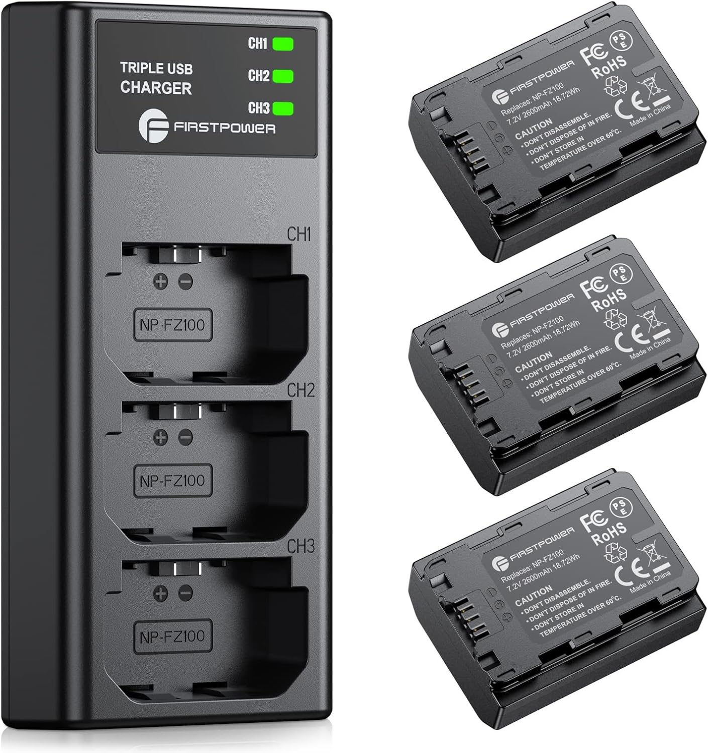 FirstPower NP-FZ100 Battery 3-Pack and Triple Slot Charger for Sony FX3, FX30, A7 III, A7 IV, A7C, A9, A6600, A6700, ZV-E1, ZV-E10 II, A7R3, A7S III/A7S3,...